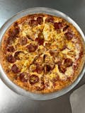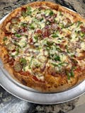 Includes pepperoni, sausage, ham, beef, mushrooms, red onions, green peppers & black olives.